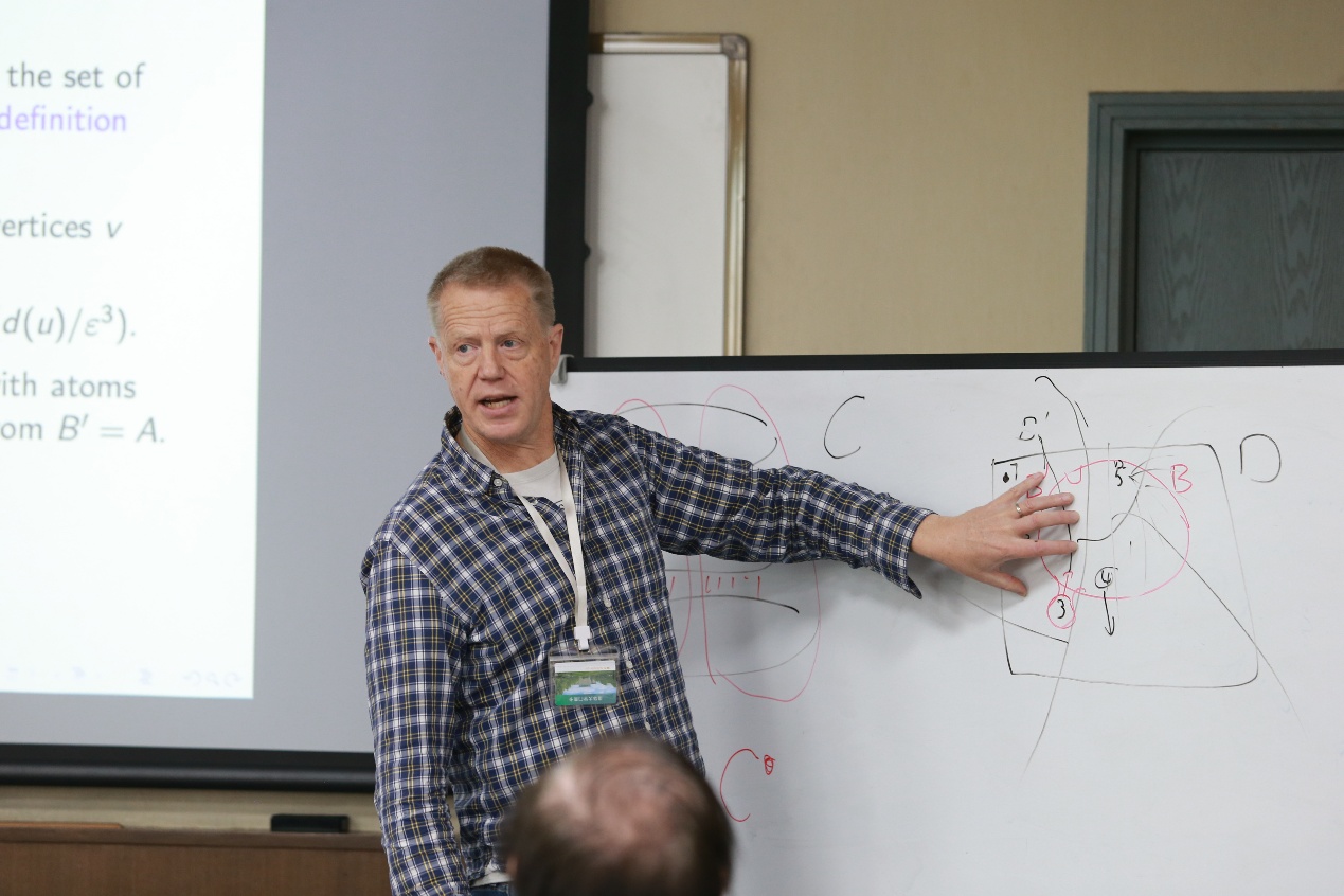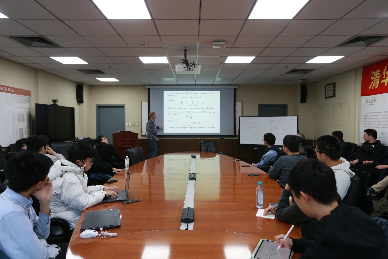 讲座期间,师生在Thorup教授引导下深入思考。2021级博士生尹龙晖表示:“Thorup教授为我们讲述了他们工作组在关系聚类问题上的最新进展。聚类问题是无监督机器学习中的一类基础问题,要求对一系列有特定关系的对象按关系的紧密程度进行分类。在线性规划问题中,通过改造之前的线性规划问题中的约束条件和目标函数形式,他们能以更短的时间求出同样近似程度的解。讲座给我带来了一定启发。”