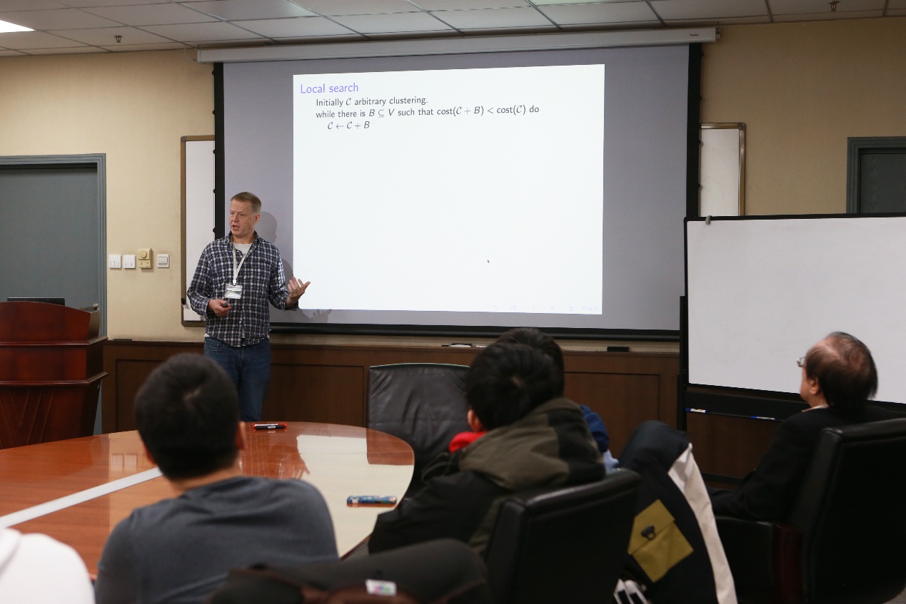 在座还包括墨尔本大学讲师王涵之,她表示:“Correlation Clustering是理论研究和应用场景中都关注的一类问题,Mikkel在报告中概述了Correlation Clustering的研究进展,讲解了基于局部搜索(local search)和基于LP的两类代表性研究方法,并对高效算法设计中算法理论结果和算法实用性间的协调问题给出了很多个人思考,令人收获颇丰。”